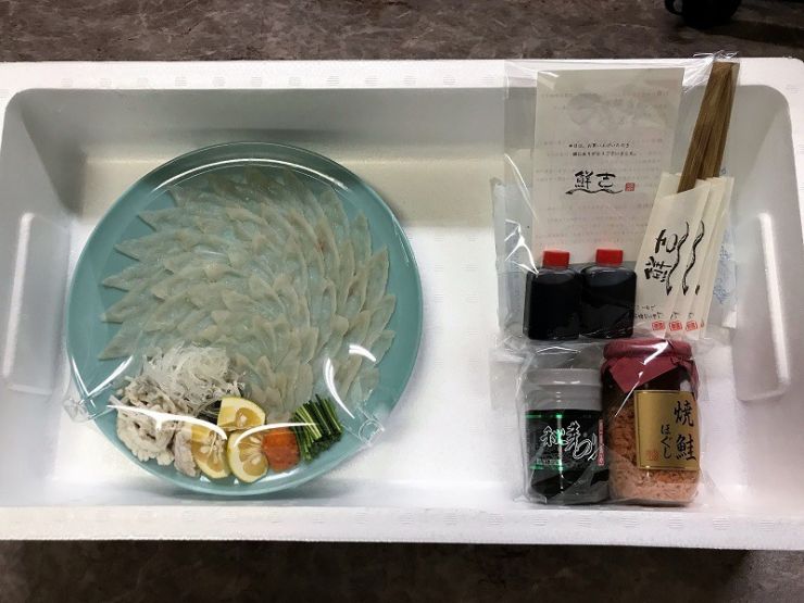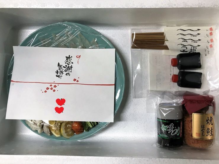 お客様のご予算やご要望をうかがいながら、内容を決めさせていただいております。この時は、ふぐ刺しと、人気の「秋目のり」&「秋鮭フレーク」を一緒に。